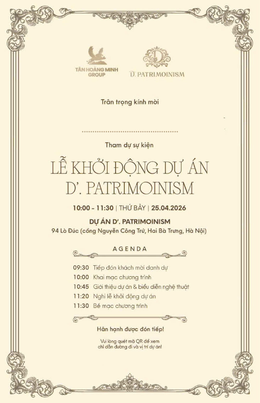 Đây sẽ là dịp để Quý khách chạm đến tinh thần cốt lõi của D’.Patrimony nơi kiến trúc, nghệ thuật và triết lý sống bền vững giao hòa trong từng chi tiết; nơi mỗi trải nghiệm được nâng niu để hình thành một chuẩn mực sống riêng biệt giữa lòng đô thị.